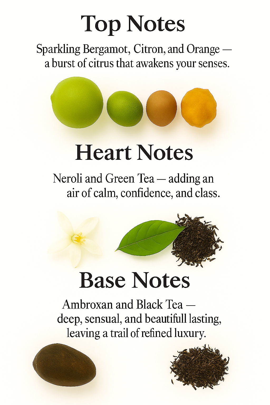 Top Notes: Sparkling Bergamot, Citron, and Orange — a burst of citrus that awakens your senses.