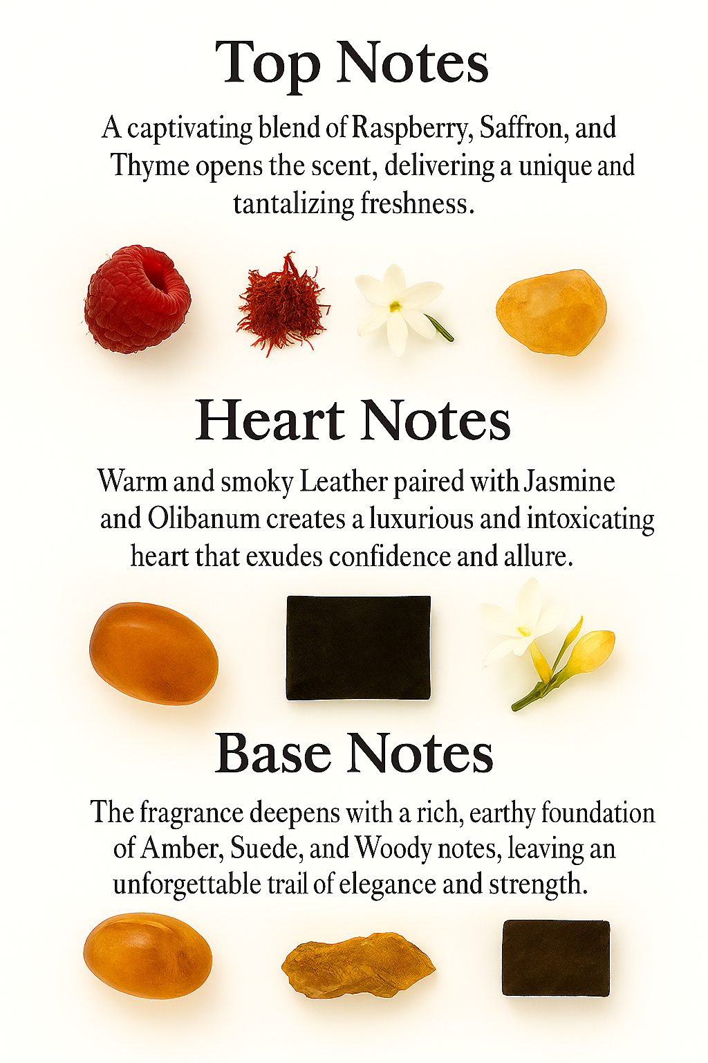 Top Notes: A captivating blend of Raspberry, Saffron, and Thyme opens the scent, delivering a unique and tantalizing freshness.