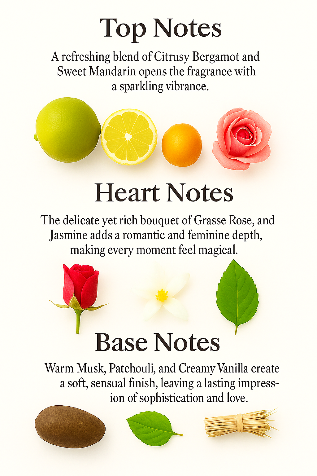 Base Notes: Warm Musk, Patchouli, and Creamy Vanilla create a soft, sensual finish, leaving a lasting impression of sophistication and love.