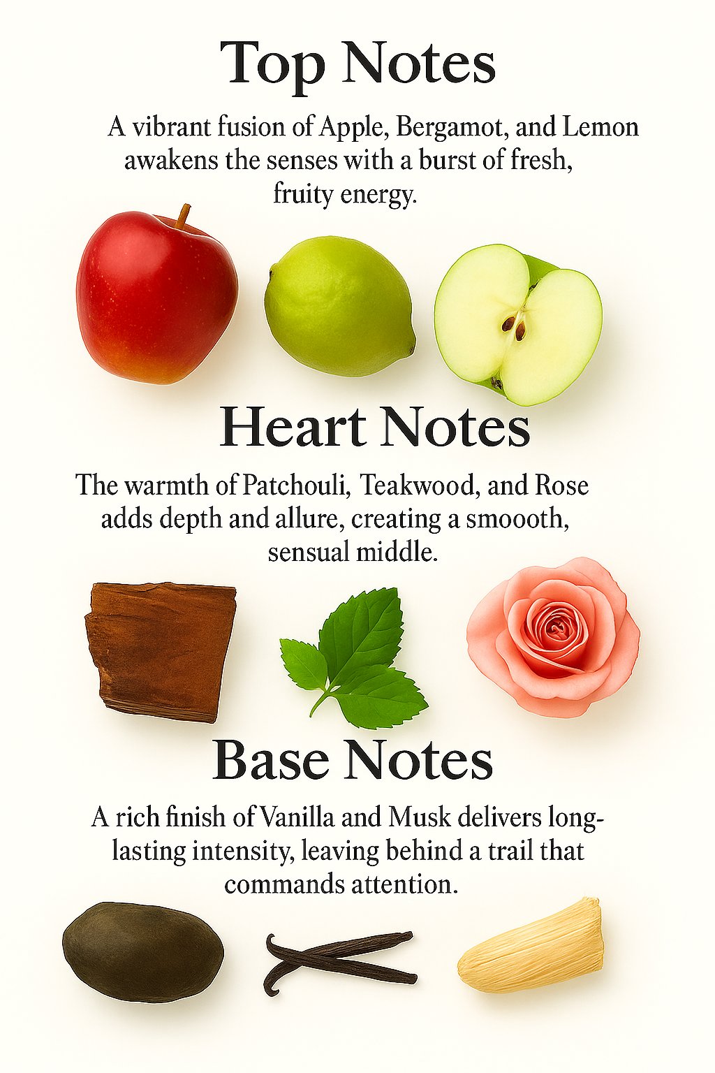 Top Notes: A vibrant fusion of Apple, Bergamot, and Lemon awakens the senses with a burst of fresh, fruity energy.