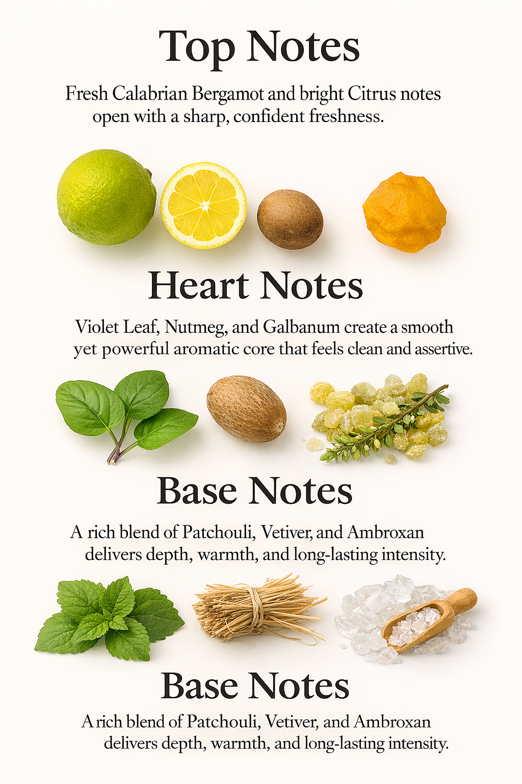 Heart Notes: Violet Leaf, Nutmeg, and Galbanum create a smooth yet powerful aromatic core that feels clean and assertive.