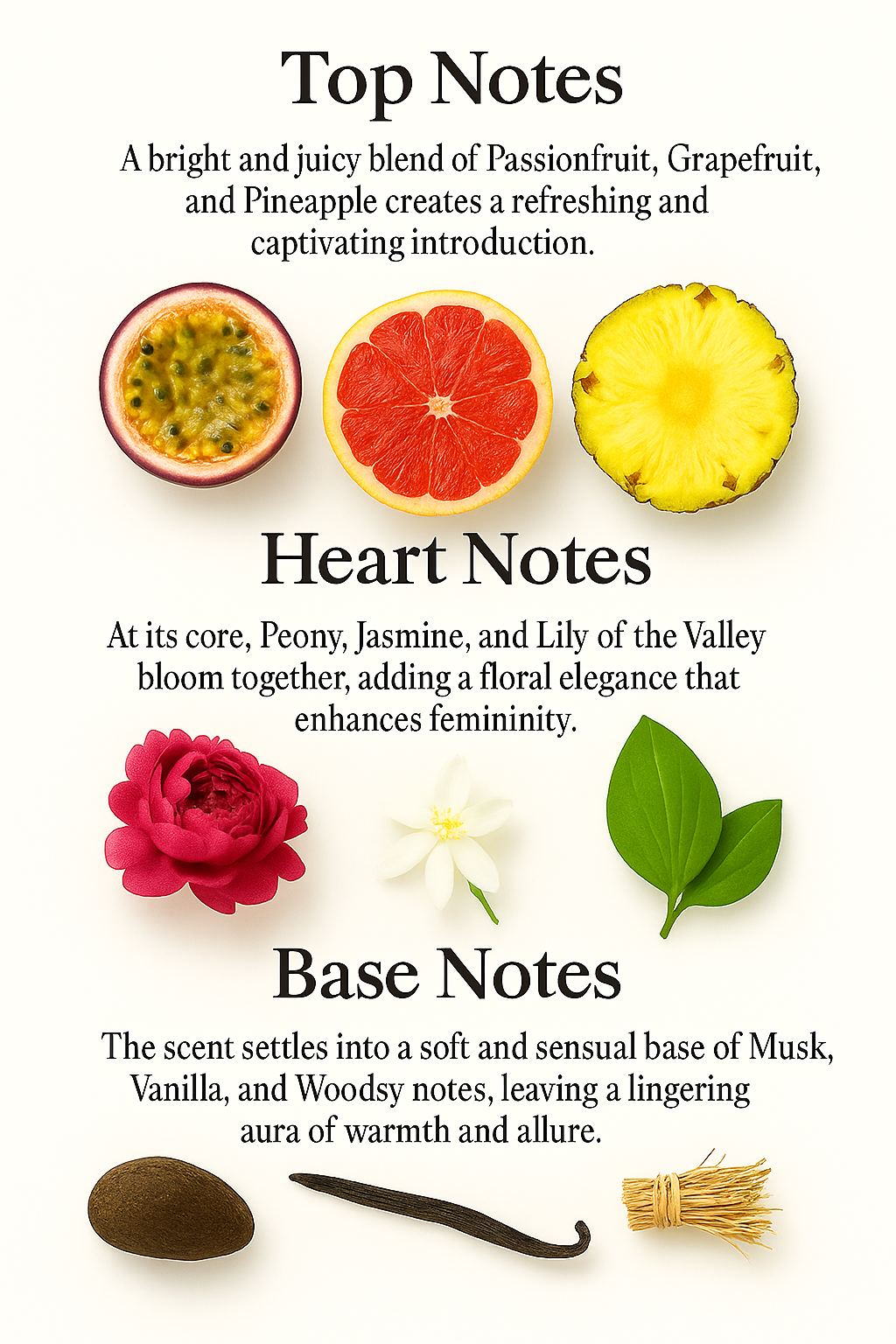 Heart Notes: At its core, Peony, Jasmine, and Lily of the Valley bloom together, adding a floral elegance that enhances femininity.