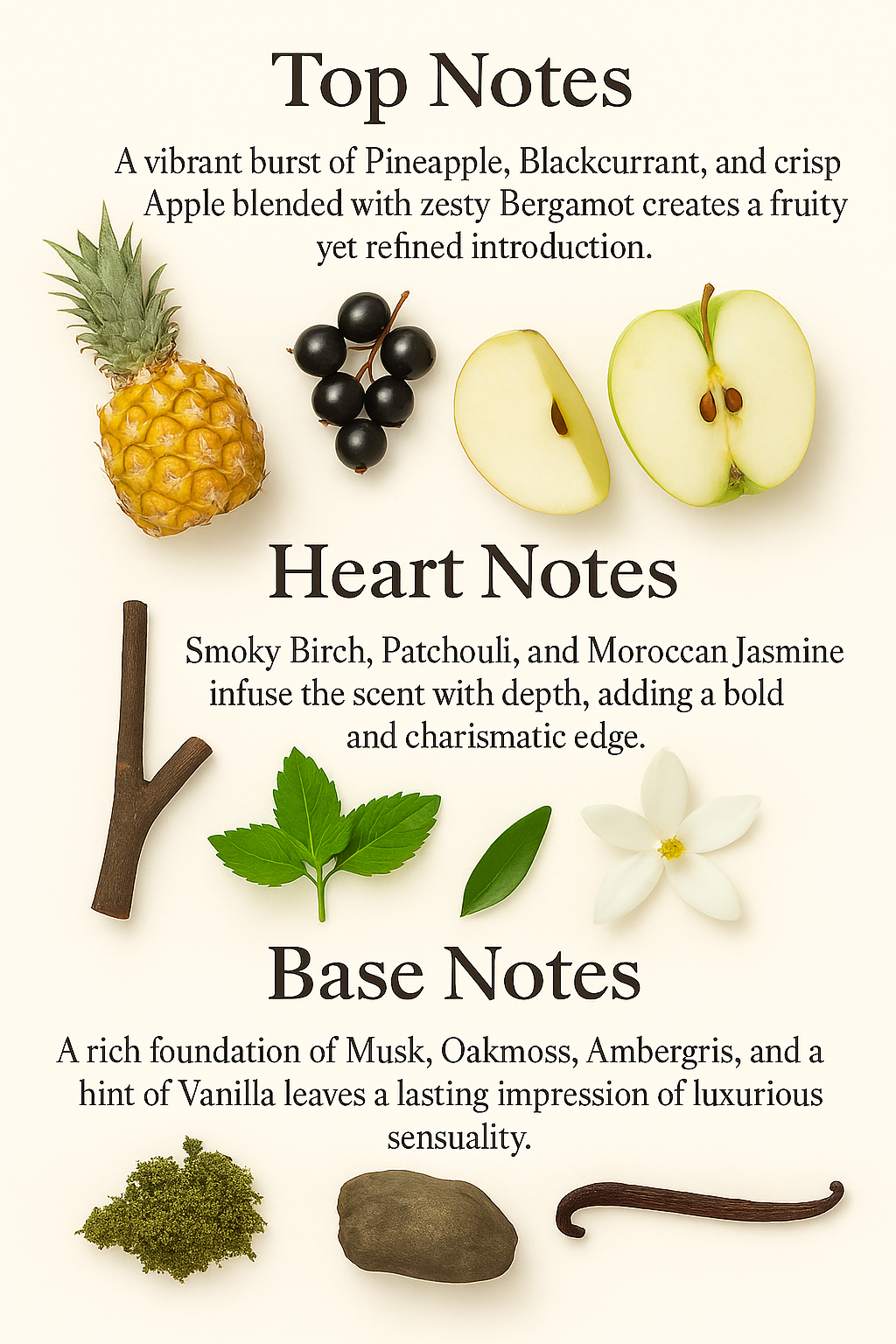Top Notes: A vibrant burst of Pineapple, Blackcurrant, and crisp Apple blended with zesty Bergamot creates a fruity yet refined introduction.