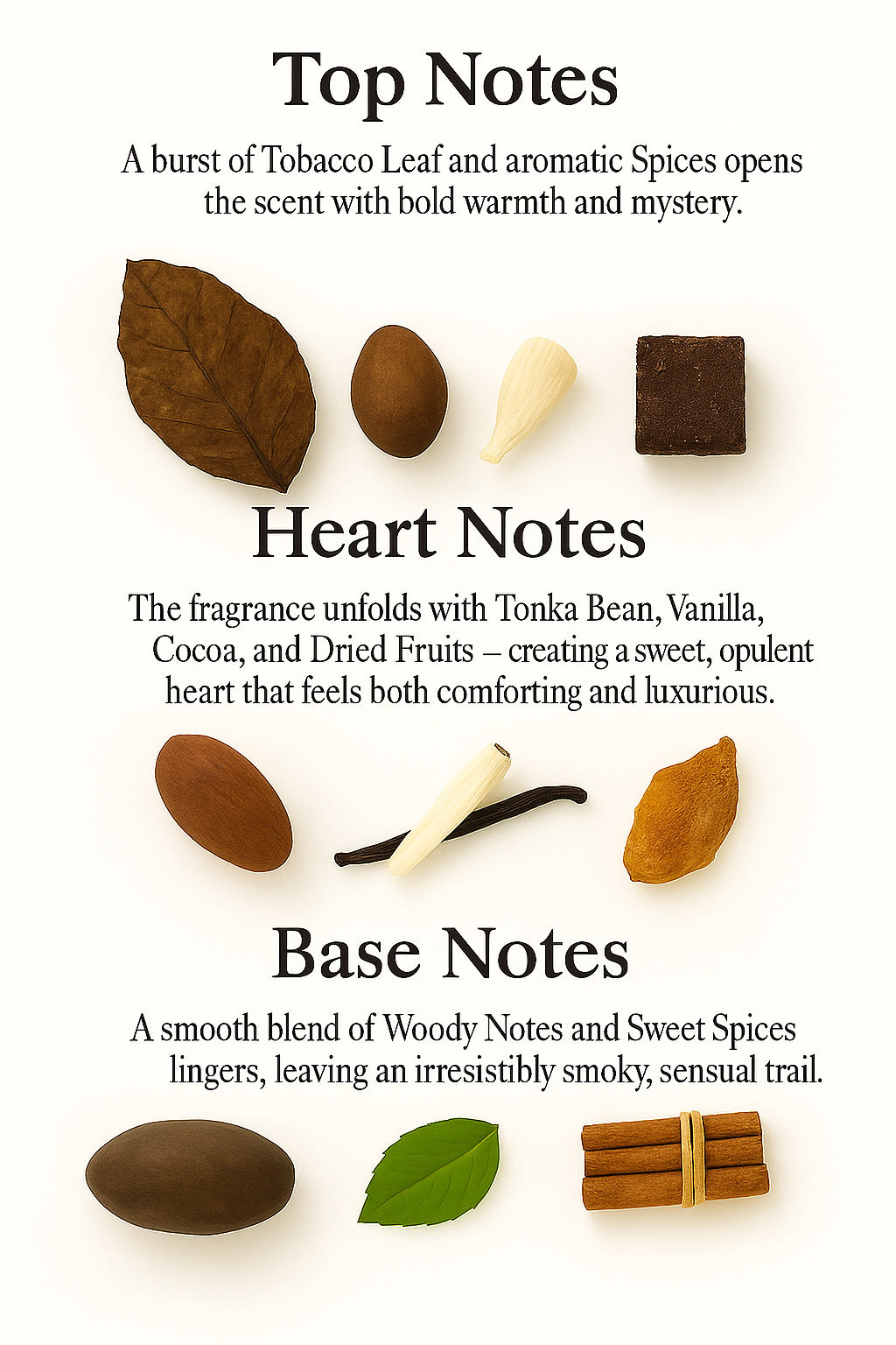 Top Notes: A burst of Tobacco Leaf and aromatic Spices opens the scent with bold warmth and mystery.
